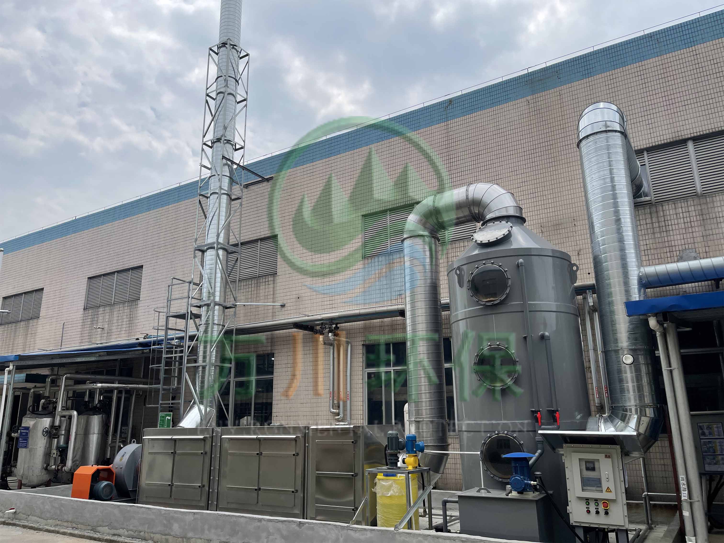 根據廢氣類型和場地需求我們采用噴淋塔+兩級活性炭對其進行處理。反應釜廢氣處理配套一臺17170風量pp噴淋塔+兩臺17170風量的不銹鋼材質活性炭吸附塔+干式過濾與大功率防爆離心風機+自動化電控柜系統。